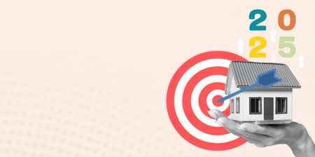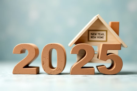 Beige '2025' alongside numbers a small wooden house model with a sign that reads 'New Year, New Home,' creating a symbolic New Year celebration theme. AI generation