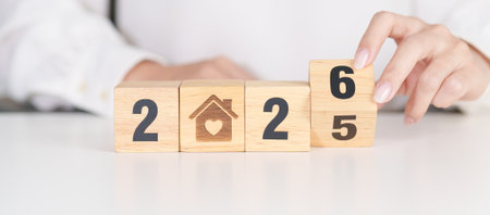 2025 end year to Happy New Year 2026 with Home and Heart block. Property investment, House Mortgage, Real Estate tax, homeless, donation, Financial and happy family concepts