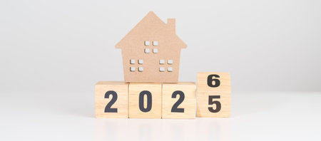 2025 end year to Happy New Year 2026 with house model. real estate, Home loan and mortgage, tax, investment, financial, savings and New Year Resolution concepts