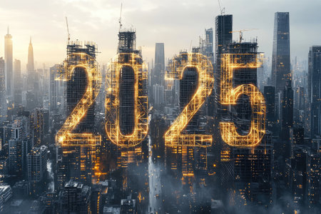 Illuminated number 2025 hovering over a futuristic cityscape at sunset, symbolizing the arrival of the new year