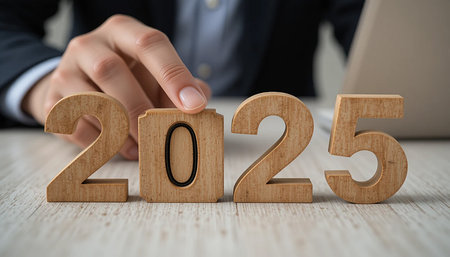 A close-up shot shows a person's hand carefully placing a wooden number '0' to complete the year 2025, symbolizing future planning.