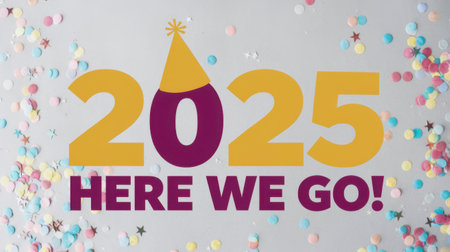 A festive image with the year 2025 displayed in large yellow and purple numbers, along with the phrase Here We Go! in purple letters, surrounded by scattered colorful confetti on a gray background.