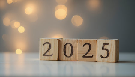 Four wooden blocks, each engraved with a number, proudly display 2025 against a dreamy backdrop of soft, glowing bokeh lights. This image captures the essence of new beginnings and the anticipation of the future, inviting viewers to reflect on the possibilities that the coming year holds.