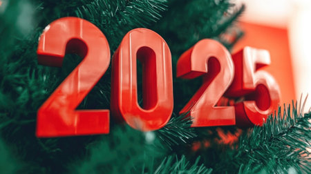 Festive red 2025 numbers on pine tree branches for new year celebrations.