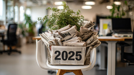 A conceptual image featuring a chair adorned with newspapers stacked to symbolize insights about the future, complemented by a green plant, reflecting growth and creativity in a modern office.