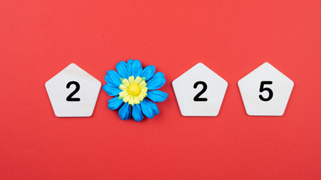 Top view, number 2025 on a wooden pentagon and blue flowers over a red background. Holidays, Celebrations, Planning for growth and success. Holiday background. Happy New Year concept 2025.