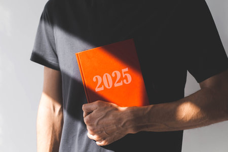 male hand holding a red diary with the text inscription 2025 on the background of a black T-shirt, concept of planning goals and plans for the new year.