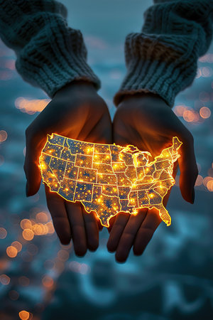 Hands holding illuminated USA map, city lights backdrop