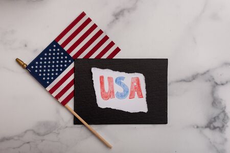 One American pride flag with USA drawn on torn piece of paper
