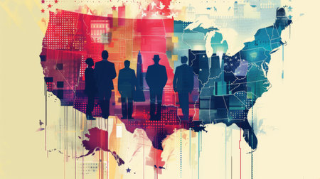 Silhouettess of business people are walking against large American flag. Concept of elections in USA