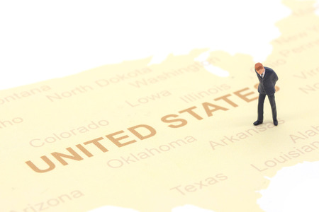 Miniature people, businessman standing on map American