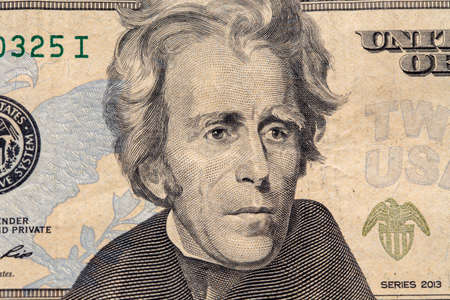 Andrew Jackson portrait macro usa twenty dollar banknote or bill.