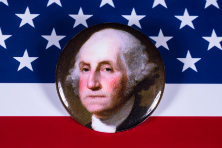 LONDON, UK - APRIL 27TH 2018: A George Washington badge pictured over the USA Flag, on 27th April 2018. Washington was the 1st President of the United States of America and a Founding Father.