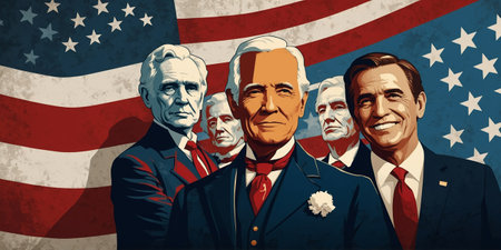 Historical American leaders depicted in a bold artistic style against a vibrant flag backdrop showcasing unity and legacy