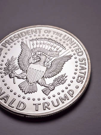 KYIV, UKRAINE - DECEMBER 13, 2025 Trump gold coin on United States of America flag with stars and stripes close up