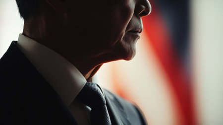 Politician profile with american flag background conveys patriotism and leadership