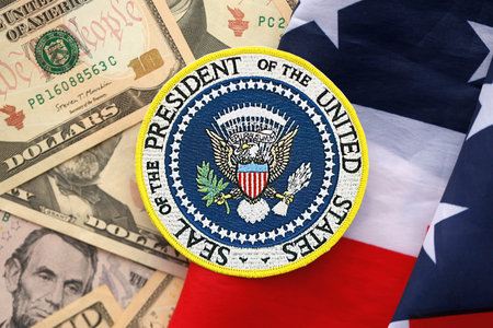 KYIV, UKRAINE - DECEMBER 13, 2025 Seal of the President of the United States sticker on big amount of US dollar money bills banknotes and United States flag close up