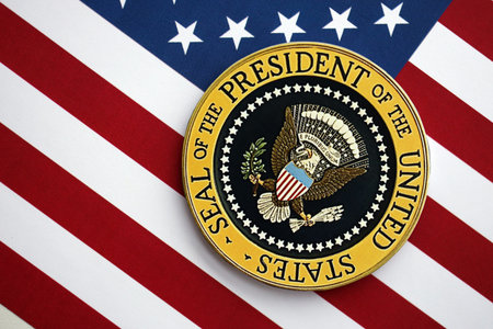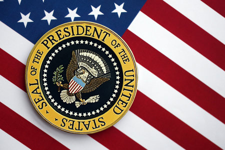 KYIV, UKRAINE - DECEMBER 13, 2025 Seal of the President of the United States sticker on United States of America flag with stars and stripes close up