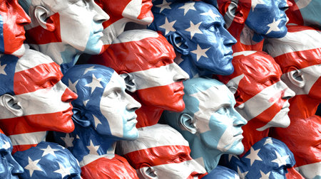 This artwork features a dynamic arrangement of human heads creating an abstract interpretation of the American flag against a smooth white backdrop.