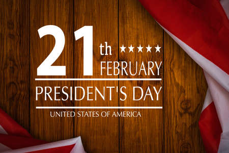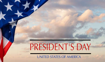 Happy presidents day with flag of the United States on wooden background. Colorful cloudy sky at sunset