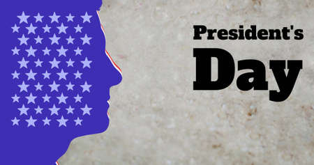 Image of faces with american flag colours and presidents day text over gray background. Global business and digital interface concept digitally generated image.