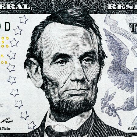 Close-up portrait of Abraham Lincoln on a 5 US dollars banknote.
