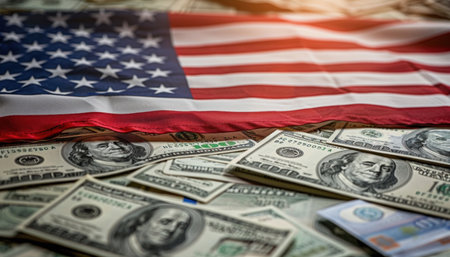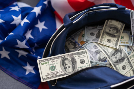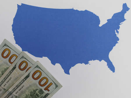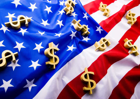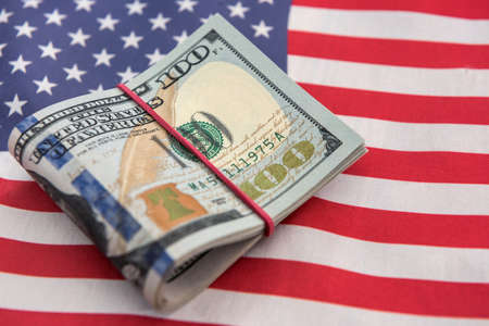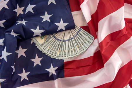 Close up of american flag and dollar cash money. Dollar banknote and United States flag on a background. Economy of USA
