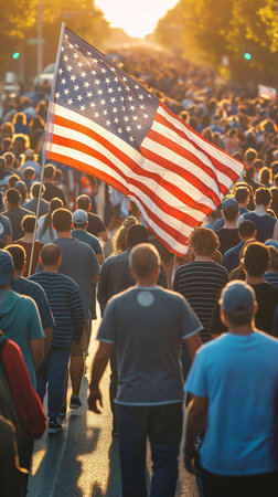 Blurred crowd out of focus standing at a city political protest, celebration or event waving american United Stated flags.