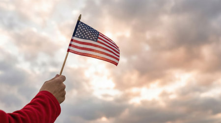 A persons hand holding a small United States flag against a dramatic and cloudy sky at sunset. The image evokes feelings of patriotism, freedom, and national pride.