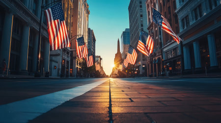 A city street with American flag waving at a sunset after the Fourth of July celebration.