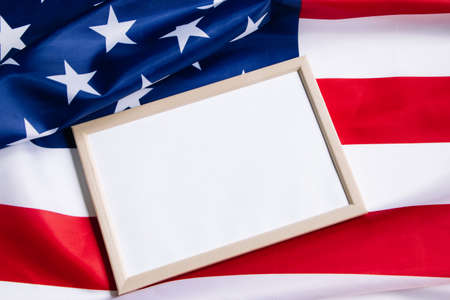 American flag and empty frame for text. Independence, Memorial Day. Concept of celebrating national holidays in the United States. Culture of the USA.