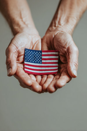 Hands Gently Holding a Miniature US Flag on Neutral Background