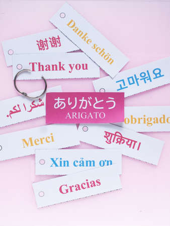 Thank you in many languages on colorful pieces of paper. Close up.