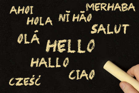 A man writes the word hello in different languages on a chalk board