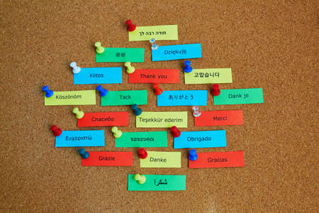 Thank You Word on colorful paper different languages pinned on cork board