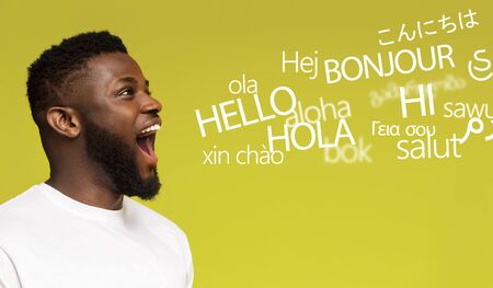 Courses concept. Young millennial afro man saying hello in many languages on yellow background
