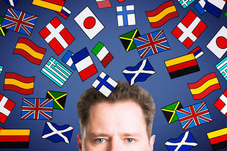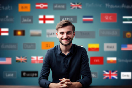 A young man smiles and looks at the camera against the background of a wall with various flags of different countries in blur. foreign language learning concepts