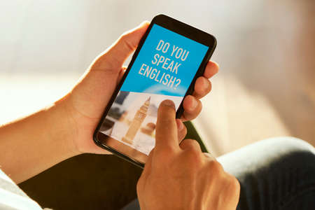 closeup of a young caucasian man, wearing casual clothes, sitting on an armchair, having his smartphone in his hands with the text do you speak English in its screen