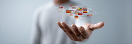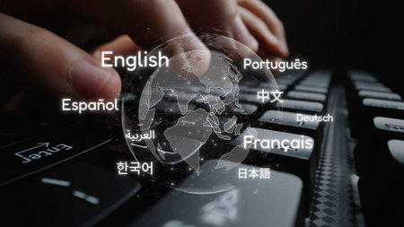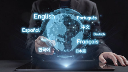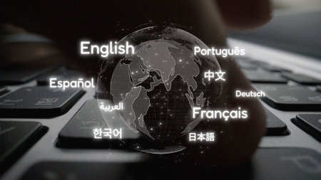 Global communication with multiple languages, digital translation tools, multilingual technology, cross-cultural communication, and virtual language learning environments.