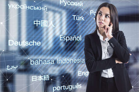 E-learning. Thoughtful young european businesswoman standing in blurry office interior with creative languages mesh. Online education and translation concept. Double exposure