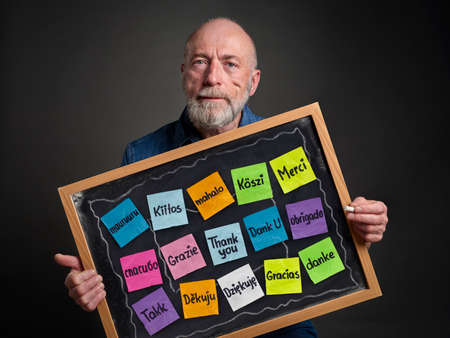 Thank you in sixteen languages - colorful sticky notes on blackboard held by a senior man
