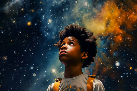 A young boy gazes at the vastness of the starry sky, feeling awe towards the cosmic artwork in the electric blue darkness of space.