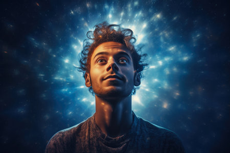 Portrait of Young Man with Cosmic Light Effects and Blue Background.
