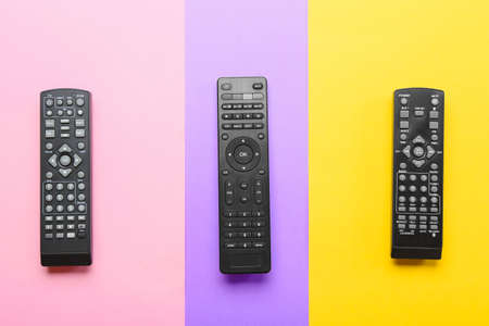 Remote controllers on a table. Top view, flat lay. Close up on a black background. copy space for text, selective focus. smart tv