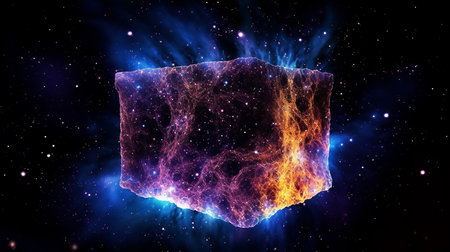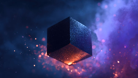 A dark, textured cube is centered within a digitally rendered nebula. The composition features vivid hues of blue and purple, contrasted with an inner glow. Floating particles add depth and visual interest. This image may be suitable for illustrating technology, science, or conceptual designs, perfect for various commercial applications.