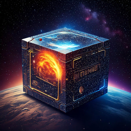 A mysterious quantum cube, a nexus of cosmic energy and infinite data, floats serenely within a vibrant nebula. Its glowing circuits pulse with otherworldly power, representing a singularity of knowledge, advanced AI, or the very fabric of a digital universe.