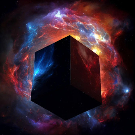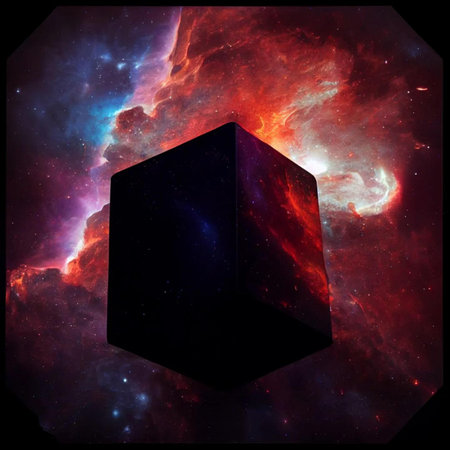 Black cube in space against a background of stars and nebula.