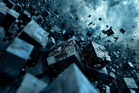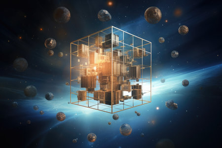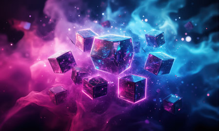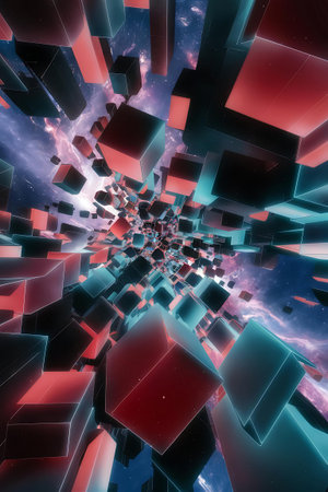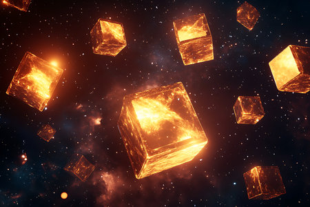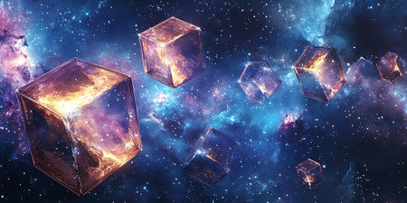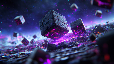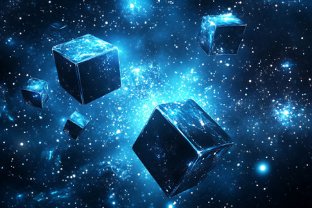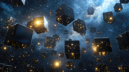 Abstract digital art featuring floating cubes in a cosmic environment.