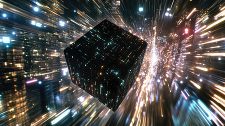 A D-rendered futuristic cube floating in a network of light trails, representing advanced computing concepts.