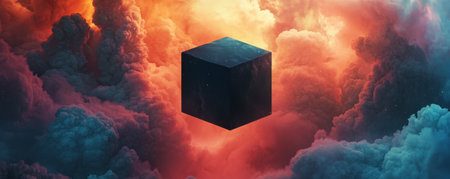 floating black cube in vibrant colorful clouds